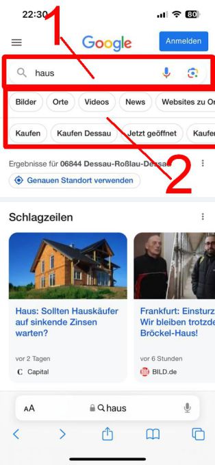 1 - Suchfeld: Tippt man in das Feld, wird die Tastatur eingeblendet, um die Suchworte einzugeben.